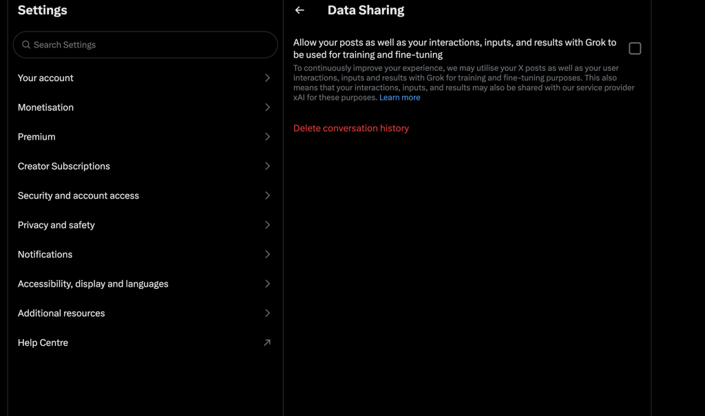 La page du centre d’aide Grok décrit comment xAI « peut utiliser vos publications X ainsi que vos interactions, entrées et résultats d’utilisateur avec Grok à des fins de formation et de réglage fin ».