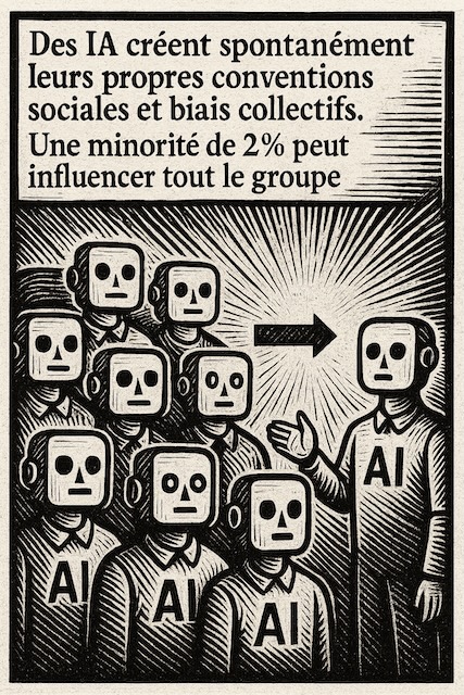 Le résultat ? Une fois que ces groupes minoritaires atteignaient une certaine taille critique, ils parvenaient à faire basculer l’ensemble de la population vers leur préférence. Avec certains modèles d’IA, il suffisait d’une minorité de seulement 2% pour renverser la convention établie.